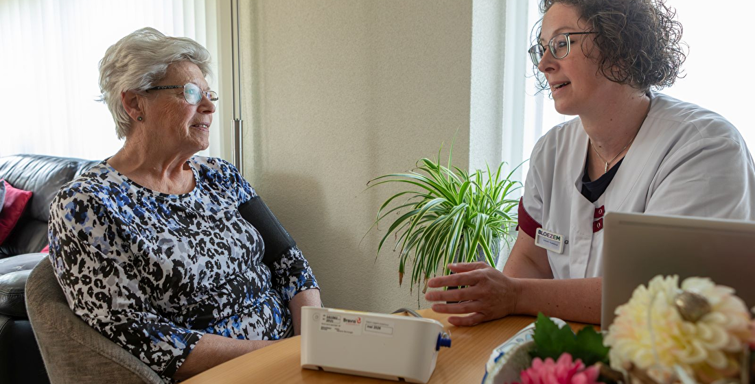 Oncologieverpleegkundige Lonneke Suykerbuyk meet de bloeddruk op bij Adrie Priem thuis.