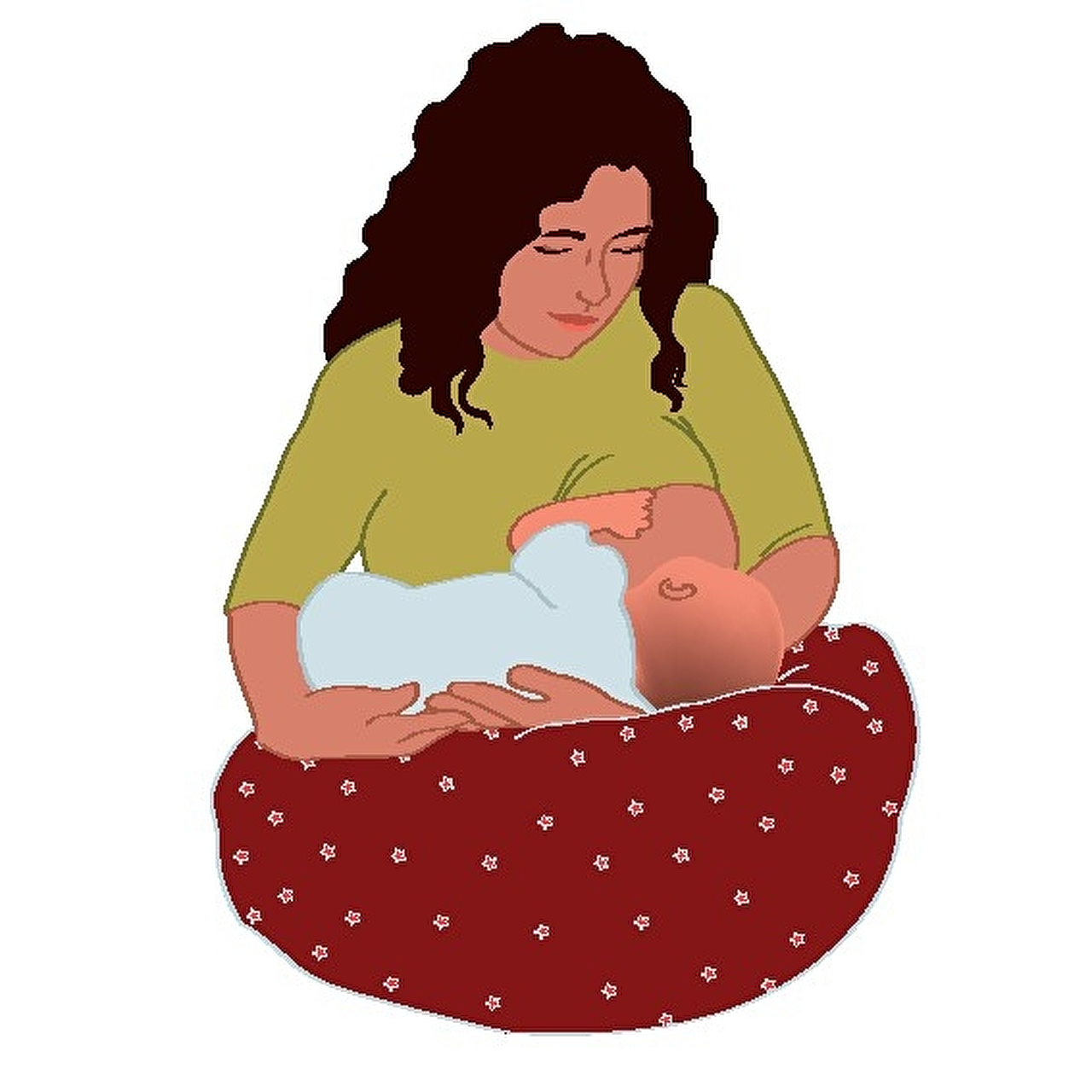 ondersteun je het hoofdje van je baby. Je onderarm steunt het ruggetje. Let erop dat je baby het hoofd vrij naar achter kan bewegen. Gebruik eventueel kussens achter je hoofd, in de rug of onder de arm om goed gesteund en ontspannen te kunnen zitten. Met de hand aan de kant waar je baby aan de borst gaat, kun je de borst vormen of ondersteunen.