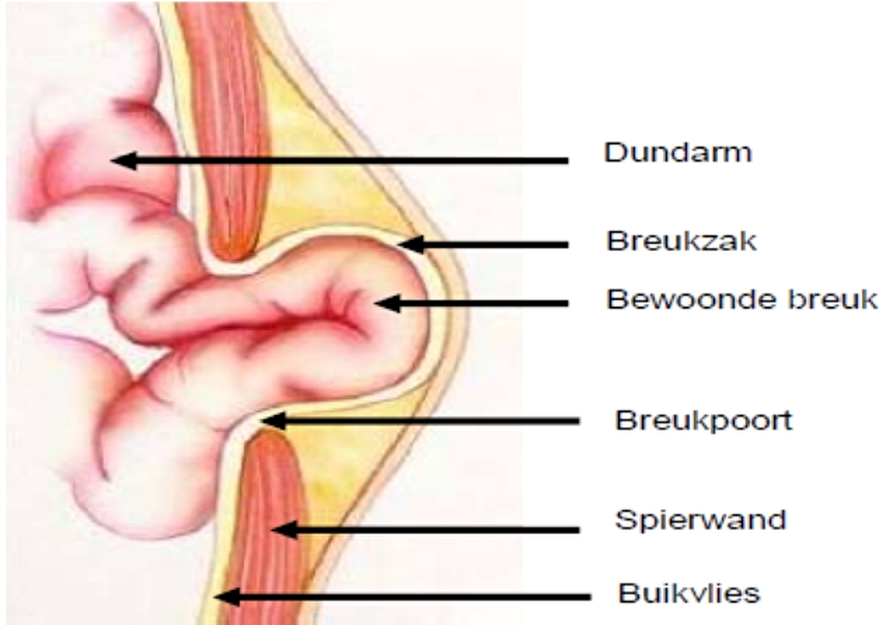 Door uitstulping van het buikvlies (=de breukzak ) kan een gedeelte van de buikinhoud hierin uitpuilen. Bij verhoging van de druk in de buik bijvoorbeeld door persen, kan er meer buikinhoud in de uitstulping komen. De breuk wordt dan groter.