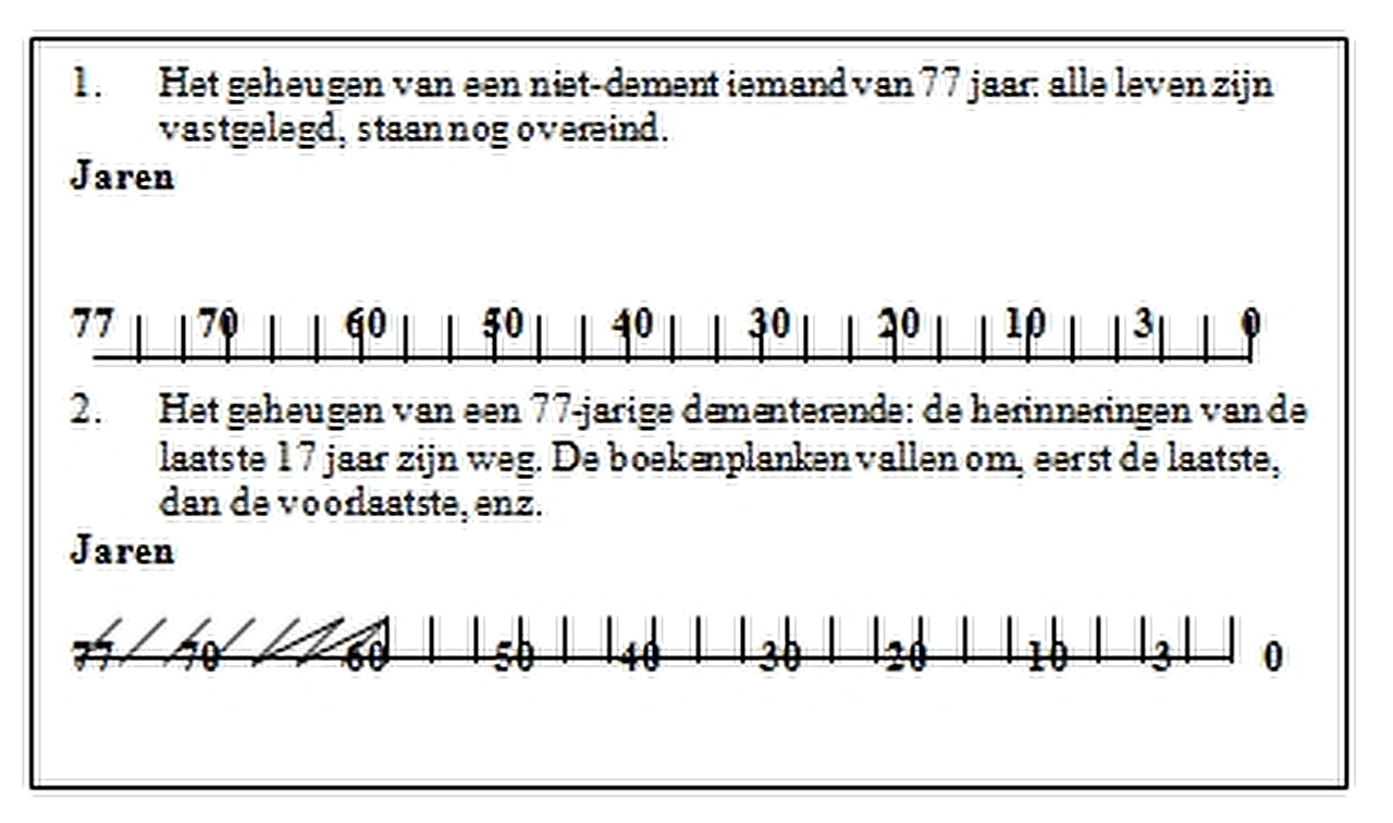 Naast een gestoorde inprenting raakt ook het geheugen zelf gestoord. De informatie in het lange termijn geheugen, rolt als het ware op. Het geheugen vergelijken we wel eens met een groot aantal dagboeken die we altijd bij ons dragen. Elke dag levert een nieuw dagboek op. Het geheugen bestaat dus eigenlijk uit een grote bibliotheek met boekenplanken. Als een persoon lijdt aan dementie en dus een gestoorde inprenting heeft, lukt het hem niet meer om de dagboeken te schrijven; ze blijven leeg. Als de dementie voortschrijdt, blijven niet alleen de dagboeken leeg maar vervaagt ook de informatie uit de andere dagboeken. Het lange termijn geheugen brokkelt af en wel van achter naar voren.