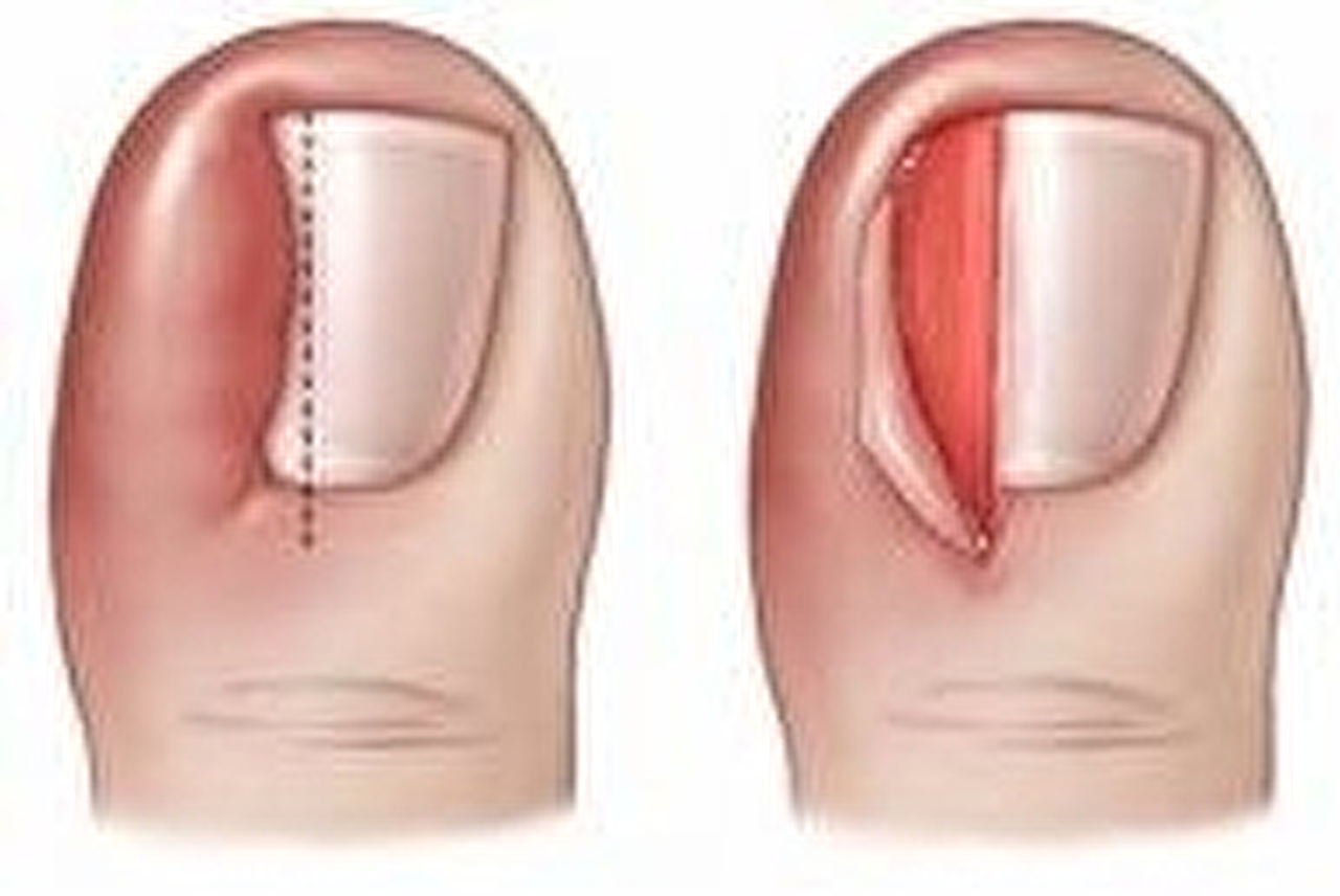 - Wanneer de mate van ingroei erger is en aanleiding geeft tot pijn, een ontsteking veroorzaakt, met of zonder verdikking van de huid en wild vlees (hypergranulatie), dan is een versmalling van de nagelrand vaak noodzakelijk.