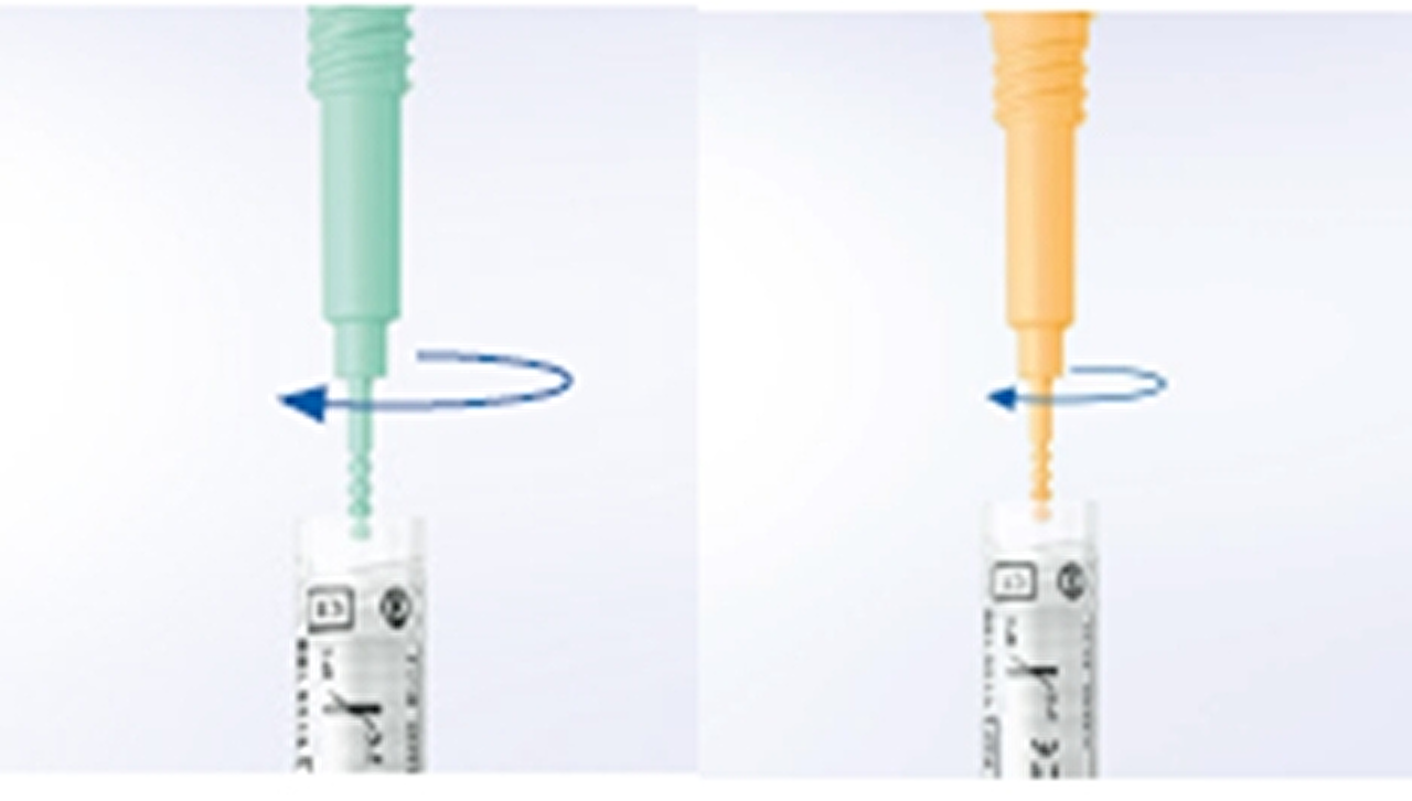 - Open de ontlastingstest alleen door aan het gele of groene dopje te draaien. De andere zijde is bestemd voor het laboratorium.