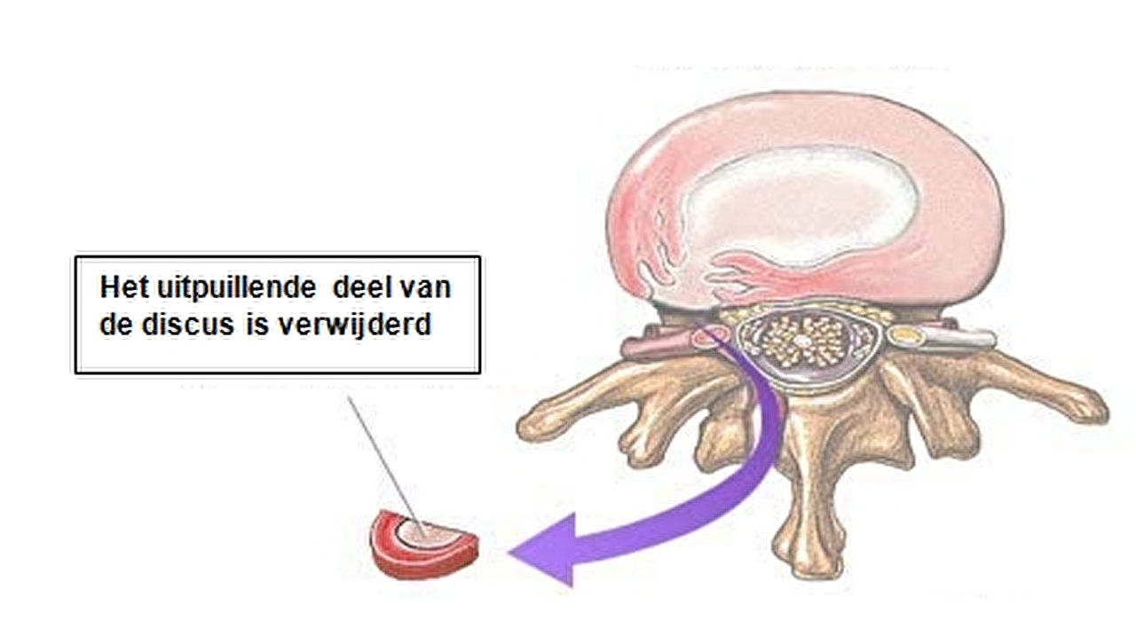 Bij een discectomie wordt een deel van of de hele tussenwervelschijf verwijderd. De neurochirurg verwijdert het deel van de tussenwervelschijf dat de zenuw beklemt (de hernia). Hierdoor komt er weer ruimte voor de zenuw wat vermindering van uw pijnklachten geeft.