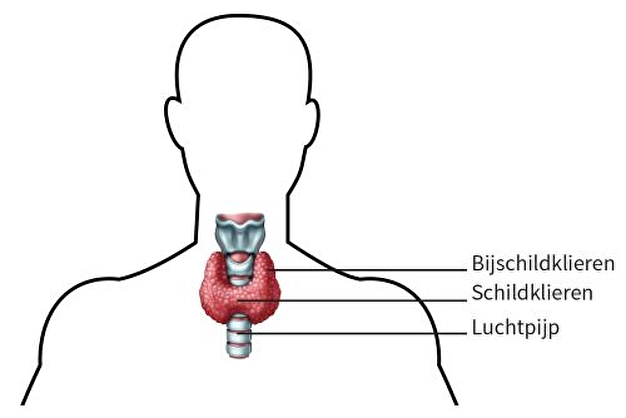 Direct tegen de schildklier aan de achterzijde, liggen vier bijschildkliertjes. Twee aan de linkerkant en twee aan de rechterkant. De bijschildklieren zijn van belang voor het regelen van de hoeveelheid kalk in het bloed.