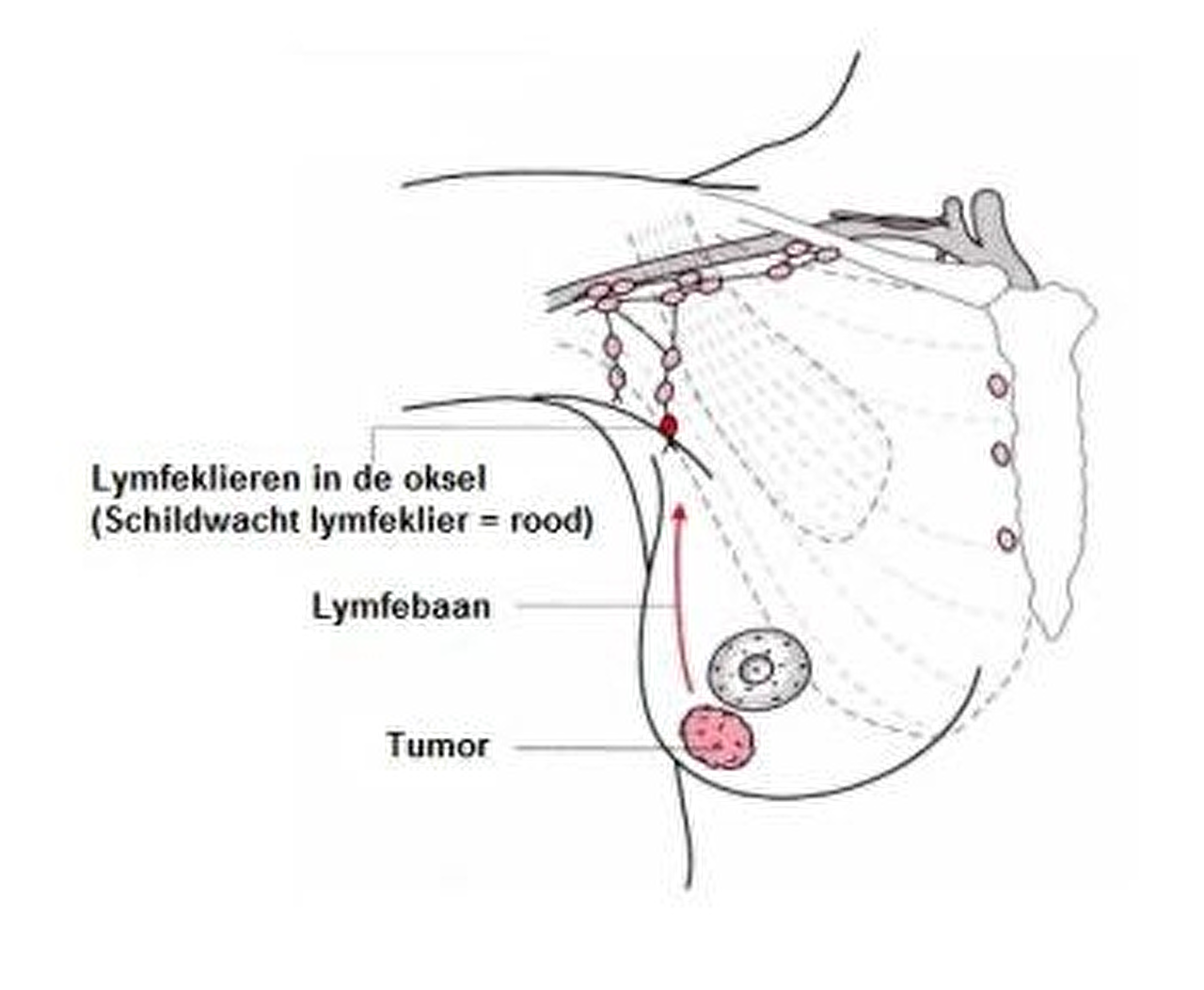 Eventuele uitzaaiingen van de tumor in de borst komen eerst in de schildwacht lymfeklier terecht.