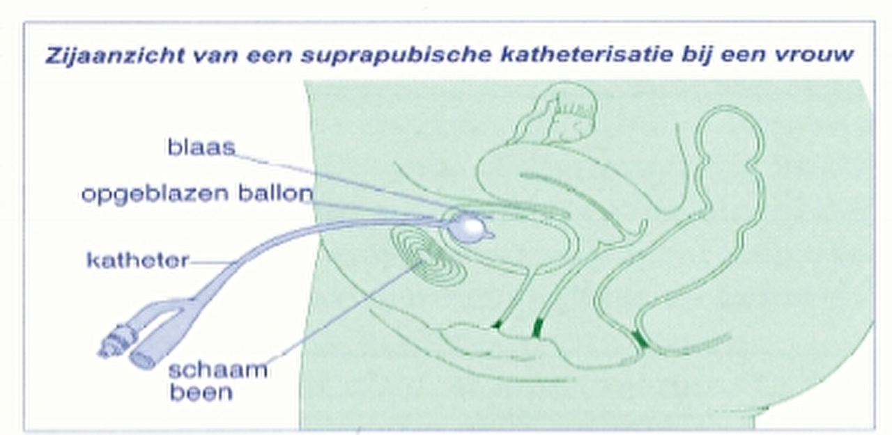 Een suprapubische katheter is een holle, soepele buis die via een klein gaatje door de buikwand urine uit de blaas afvoert. Het gaatje zit net boven het schaambeen. Aan het uiteinde van de katheter zit een ballonnetje. Om te vermijden dat de katheter los komt wordt, na het inbrengen van de katheter, dit ballonnetje met water/ glycerine gevuld. Naarmate de blaas zich vult, wordt de urine via de katheter afgevoerd naar een opvangzak. U kunt dus niet normaal plassen wanneer u een katheter met beenzak heeft. Spontaan plassen is wel mogelijk als u een suprapubische katheter heeft met een stopje. De uroloog brengt de suprapubische katheter in tijdens een korte ingreep op de polikliniek urologie.