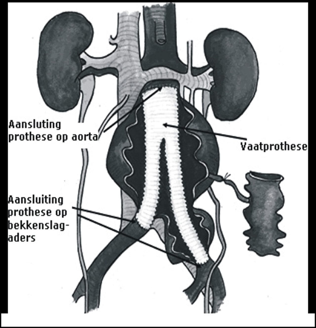 De operatie vindt plaats op locatie Bergen op Zoom. De verwijding van de aorta moet worden uitgeschakeld met een vaatprothese (kunststof bloedvat). Het bloed stroomt dan door de prothese waardoor de druk van de verwijde vaatwand weggenomen wordt. De operatie kan op twee manieren worden uitgevoerd.