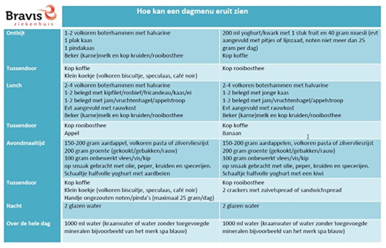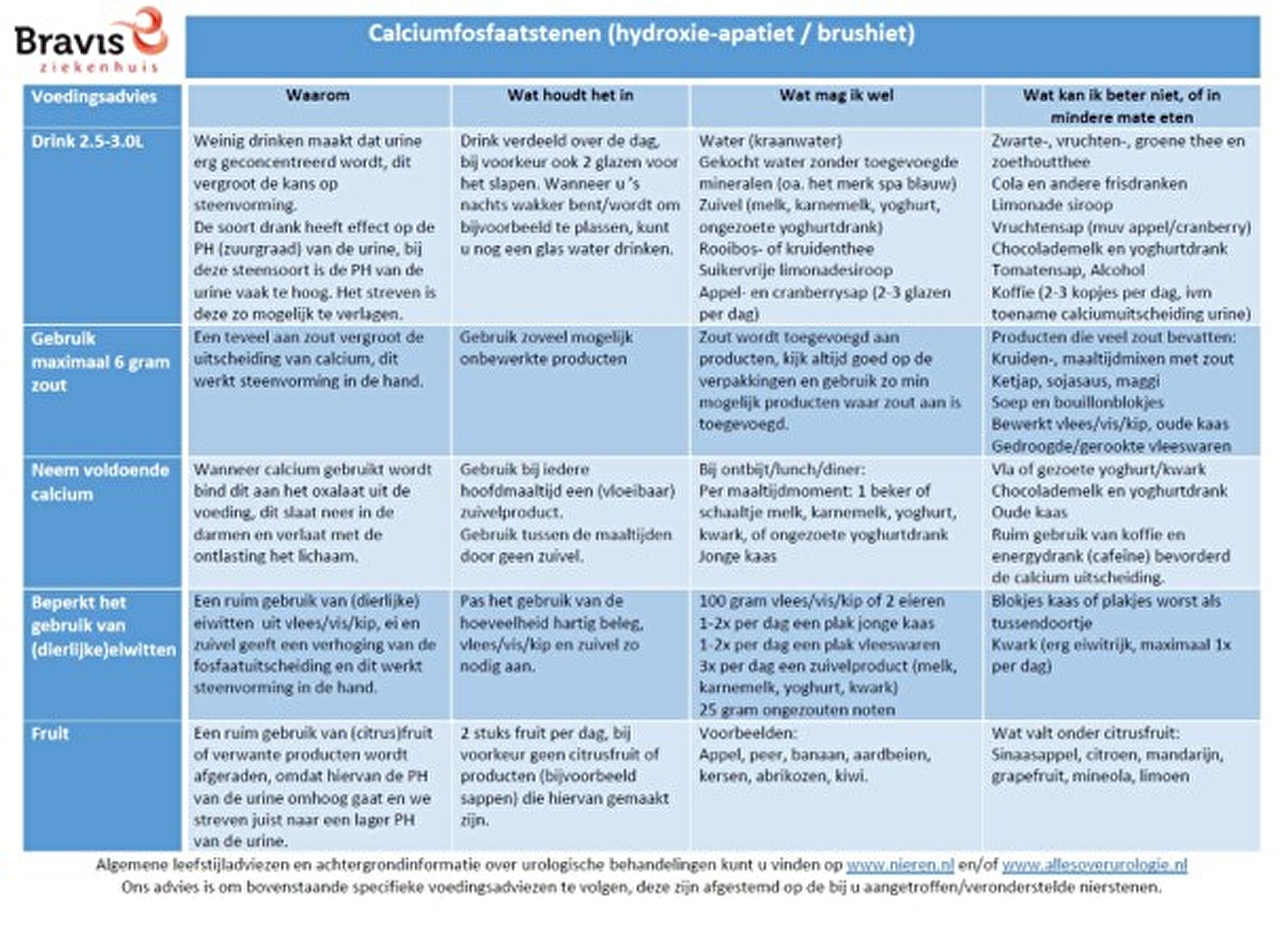 Onderstaand vind je voorbeelden van voedingsadviezen per soort niersteen. Deze schema’s werden samengesteld door de afdeling diëtetiek van het Bravis ziekenhuis.