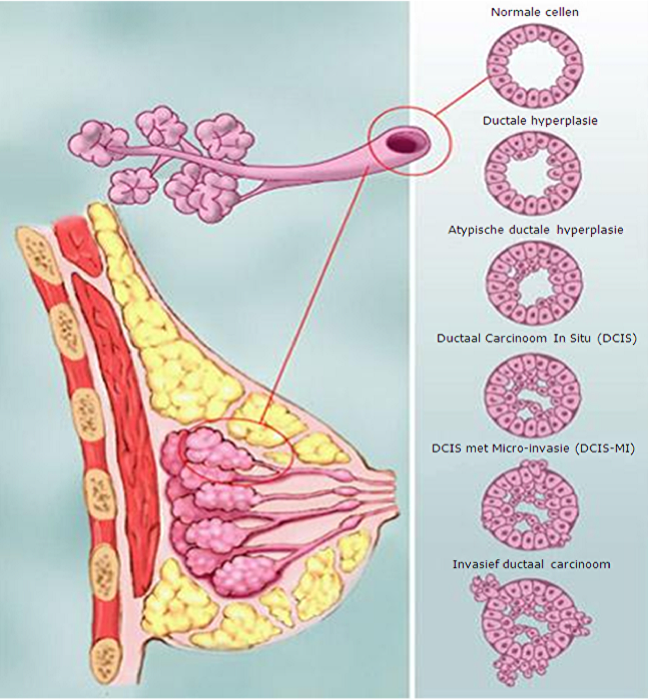 In de borst zitten melkgangen (ducti). Dit zijn plaatsen waar woekering van cellen kan voorkomen. Als de kwaadaardige cellen binnen de begrenzing van de melkgang blijft, spreken we van borstkanker in situ: DCIS, ductaal carcinoom in situ. Dit is een voorstadium van borstkanker, waarbij de cellen al wel de vorm hebben van kankercellen, maar nog niet het vermogen hebben om in het omliggende weefsel te groeien en eventueel uit te zaaien.